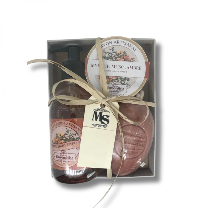 Coffret Myrrhe Musc Ambre Savon Boite +Savon Corde +Savon Liquide